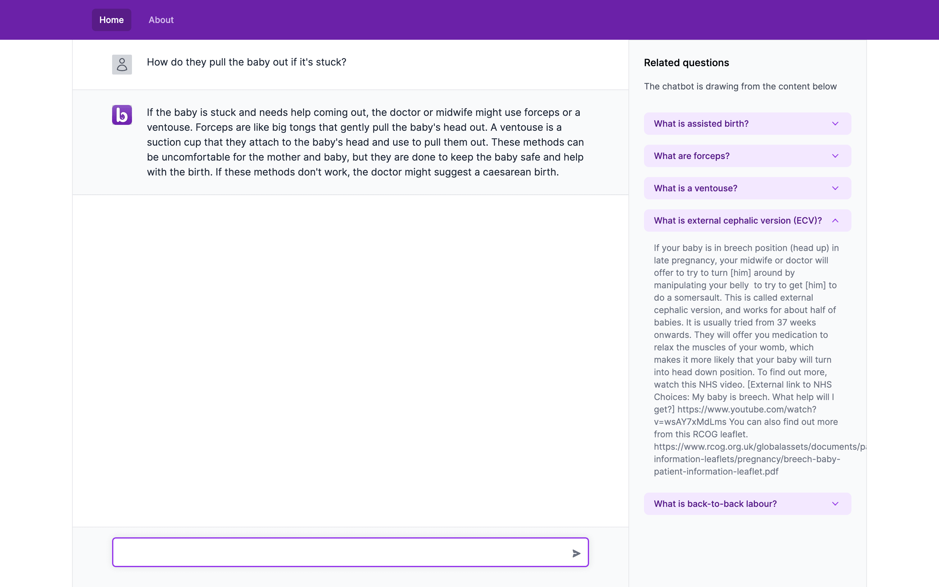 This is a prototype built in half a day as part of Nesta's Generative AI Exploration Day, with Anna & Clare from Best Begginings (the charity behind the Baby Buddy app). The premise was to build a custom chatbot which responds to questions using referenceable content from Baby Buddy, also mimicking their style of writing which is concise and easy to read.